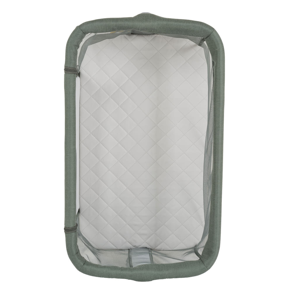 A jó szellőzés és a szülők általi láthatóság érdekében pedig a kiságy négy oldala nagyméretű hálós ablakokkal készült.