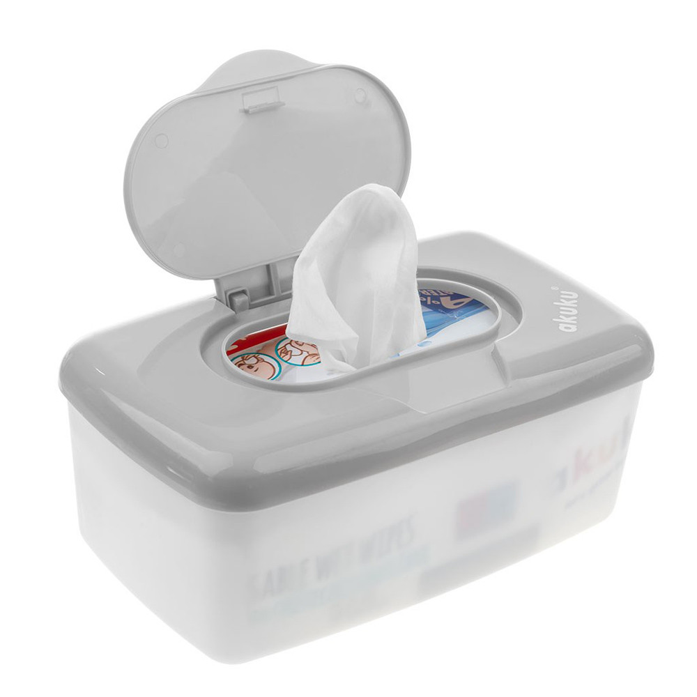 Akuku Törlőkendő tároló doboz - szürkePraktikus, funkcionális doboz nedves törlőkendők számára, mely otthon, útközben és séta közben egyaránt használható. Kis méretének köszönhetően könnyen elfér egy táskában. A doboz védi a törlőkendőket a kiszáradástól, könnyen használható. A nagy gombos fedél lehetővé teszi, hogy egy kézzel is könnyedén kinyithassa.Tökéletesen illeszkedik az "akuku" nedves törlőkendőhöz