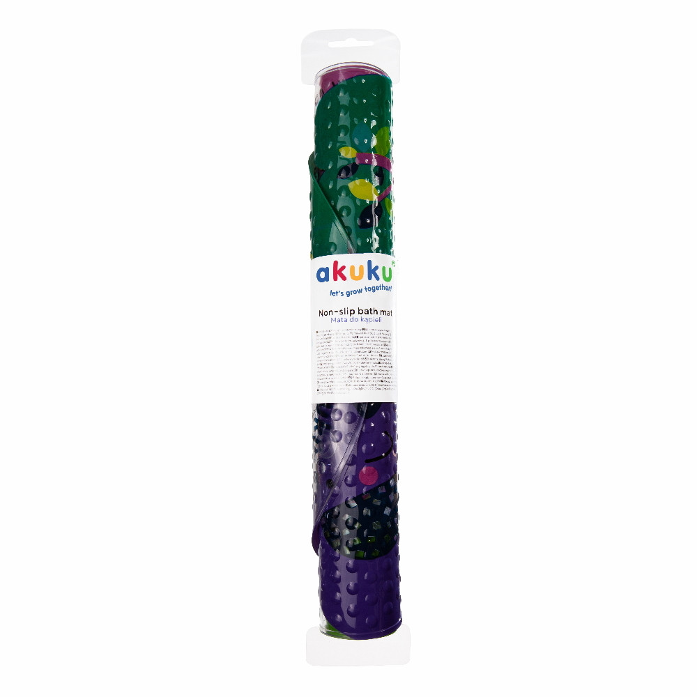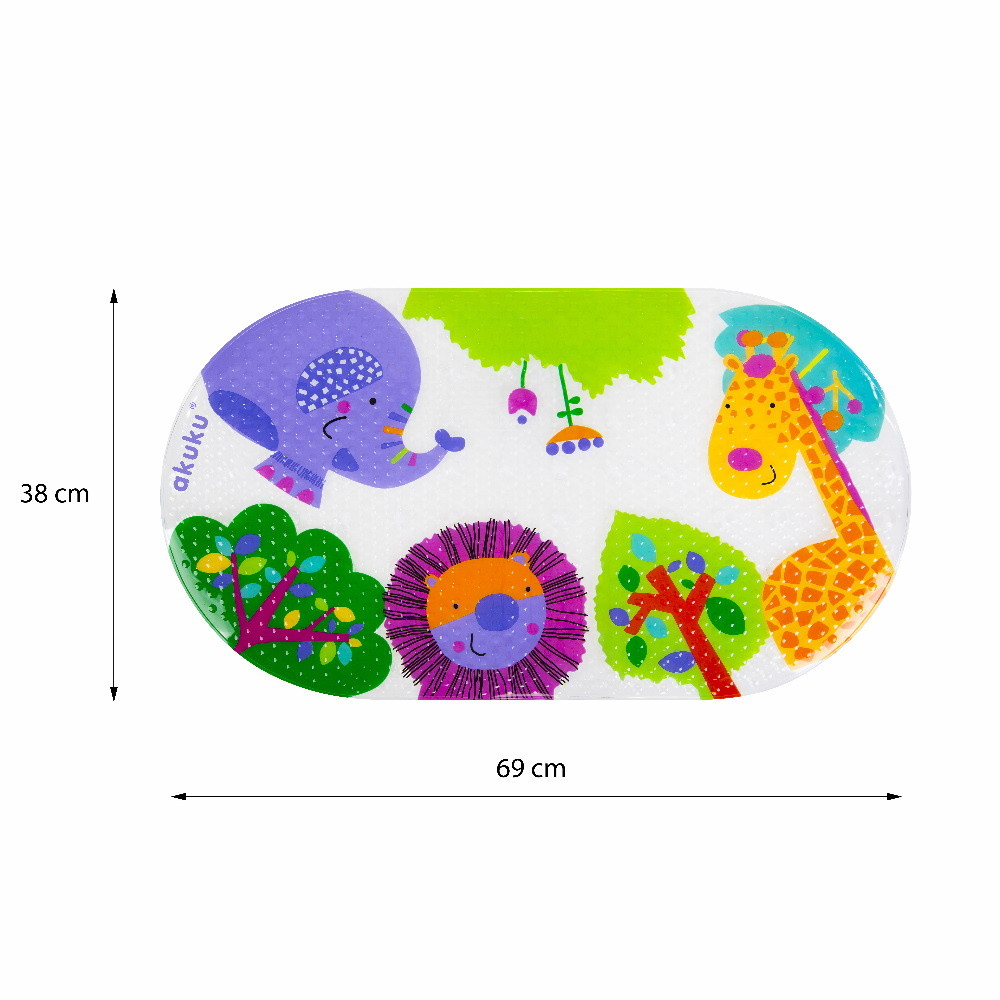 Akuku csúszásgátló kádba 69x38cm szafariA praktikus, csúszásmentes „akuku” tapadókorongos fürdőszőnyeg gyermekfürdőkádakban, nagyméretű kádakban és zuhanyzókban való használatra készült.Megakadályozza a baba elcsúszását fürdés közben. A szőnyeg vonzó kialakítása ösztönzi gyermekét a fürdésre.Előnyök:- növeli a biztonságot fürdés közben,- tapadókorongokkal rendelkezik, amelyek hatékonyan megakadályozzák a szőnyeg elmozdulását,- a születés pillanatától használható,- ftalátmentes,- kiváló minőségű PVC-ből készültAz első használat előtt és minden további használat után mossa le a szőnyeget enyhe folyékony meleg vízben, alaposan öblítse le és hagyja megszáradni. Tárolja száraz helyen.Használati utasítás: A szőnyeg megfelelő rögzítéséhez először töltse fel a kádat vízzel, majd helyezze be a szőnyeget és nyomja egyenletesen a talajhoz. Fontos! Fürdés közben a gyermeket soha ne hagyja felnőtt felügyelet nélkül!Figyelem! A termék nem játék. A fel nem használt szőnyeget tartsa távol a gyermektől. Minden használat előtt ellenőrizze a terméket. A sérülés vagy kopás első jelei esetén dobja ki.Biszfenol A-tól (0% BPA) teljesen mentes termék.Egy darab található a csomagban.Méretek: 69 × 39 cm