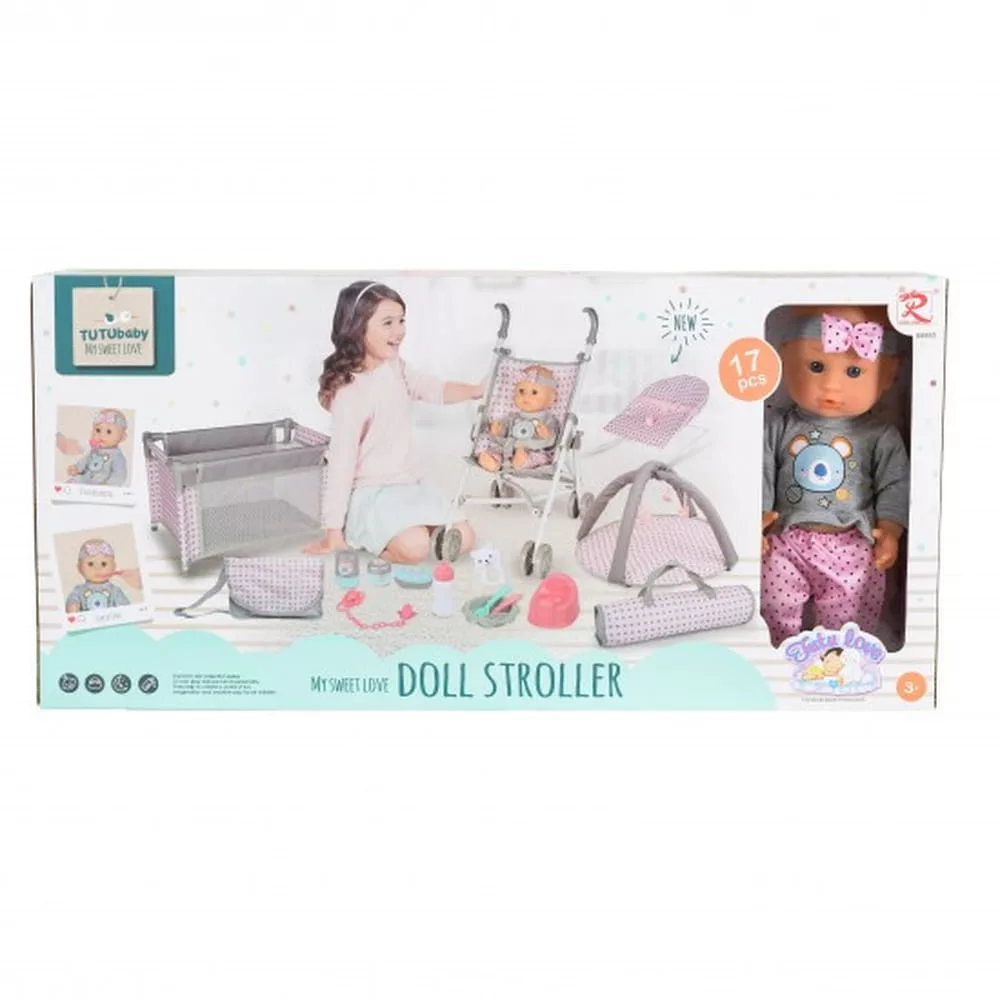 Gyermekjáték készlet, amely tartalmaz egy 36 cm-es lány babát, rózsaszín és szürke ruhában, nadrágban, 1 db összecsukható kiságyat, 1 db pihenőszéket/nyugágyat, egy activity matract, etetési kiegészítőket. 1 db kis játék babakocsit, 1 db kis játék táskát és kiegészítőket. (bili, cumisüveg, egyebek). A babának haja nincs, öltöztethető, ölelhető kisbaba. 3 évesnél idősebb gyermekeknek ajánlott, szülői felügyelet mellett, az apró alkatrészekre ügyeljen, hogy a gyermekek szájába ne kerüljön. Különböző szerepjátékra alkalmas kiegészítőket tartalmaz, amelyek a gyermekek kreativitását és gondoskodását ösztönzik.