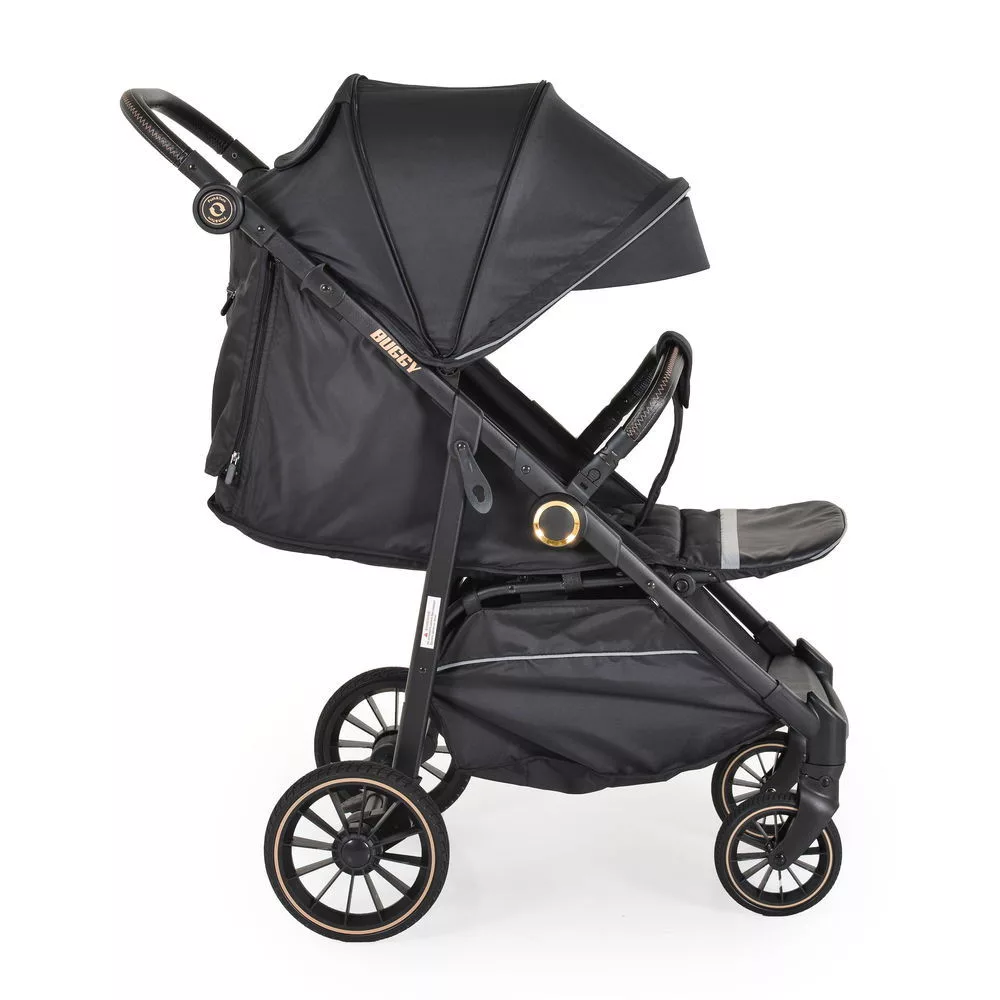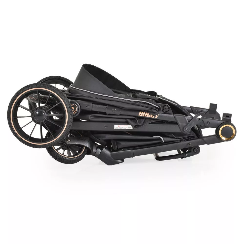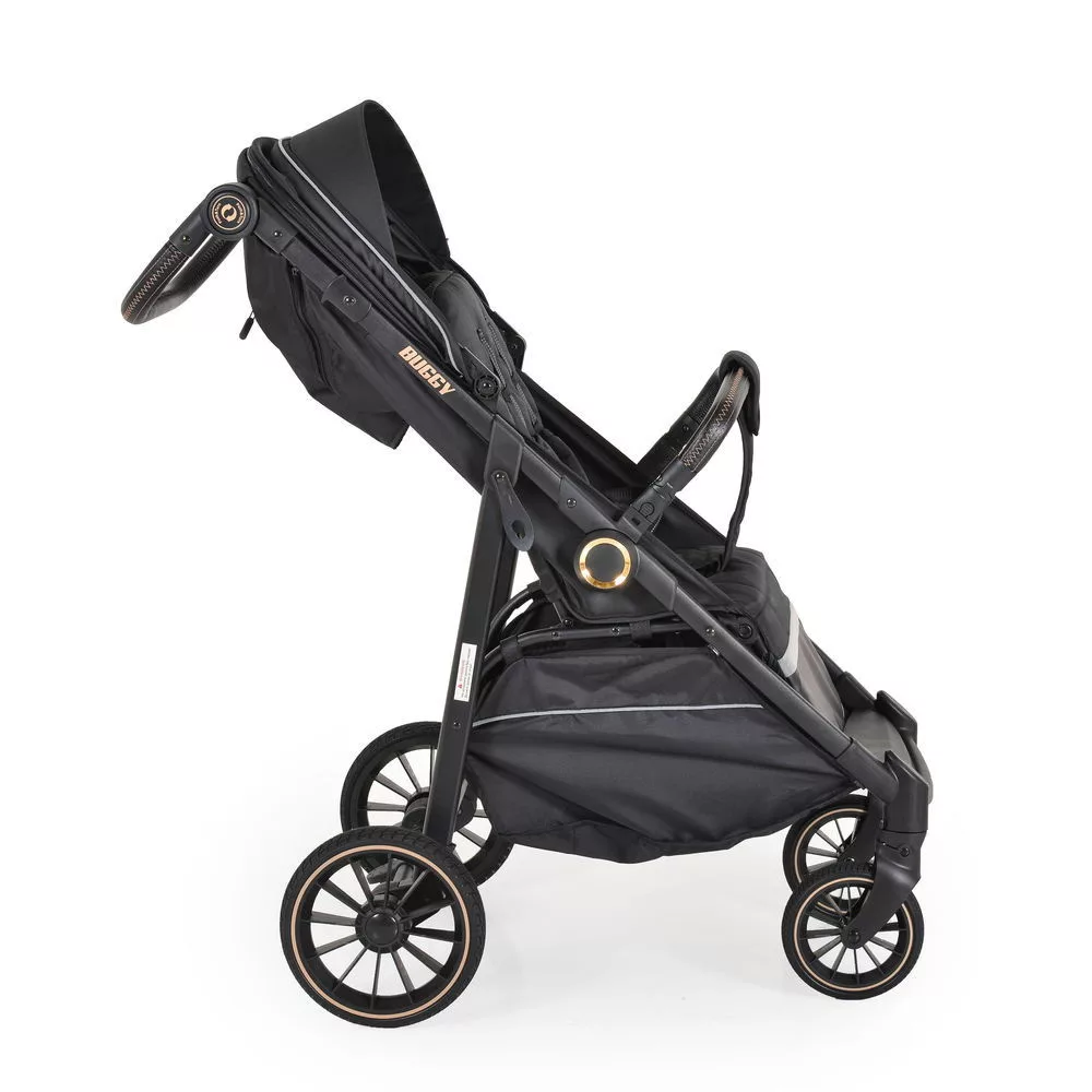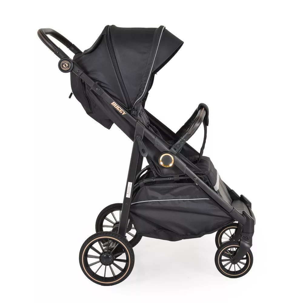 BUGGY babakocsi lapracsukható, nagy kerekek, könnyű FEKETE, Gyors, egyszerű és kompakt. Nyitás egy kézzel; Állítható háttámla 3 pozícióban; Teljesen fekvő helyzetben; Széles, kényelmes ülés mérete 80/35 cm.