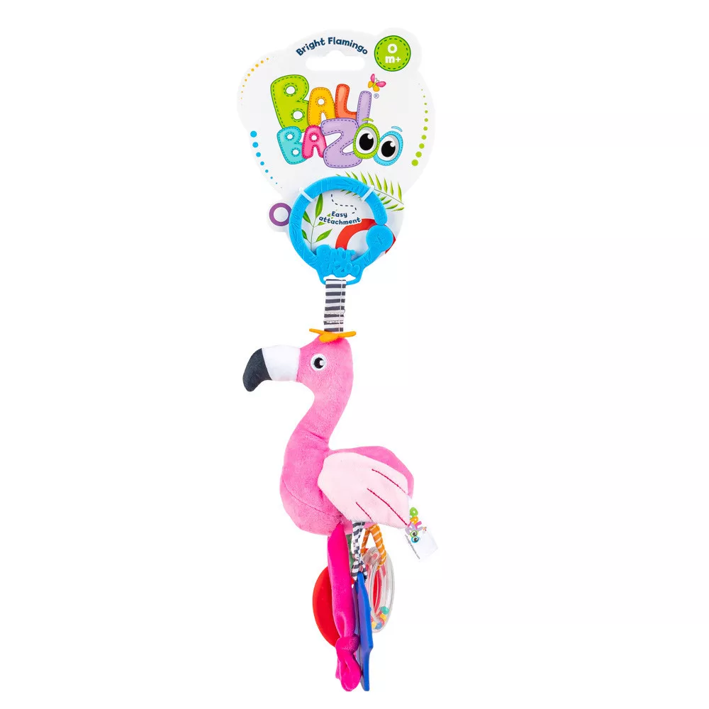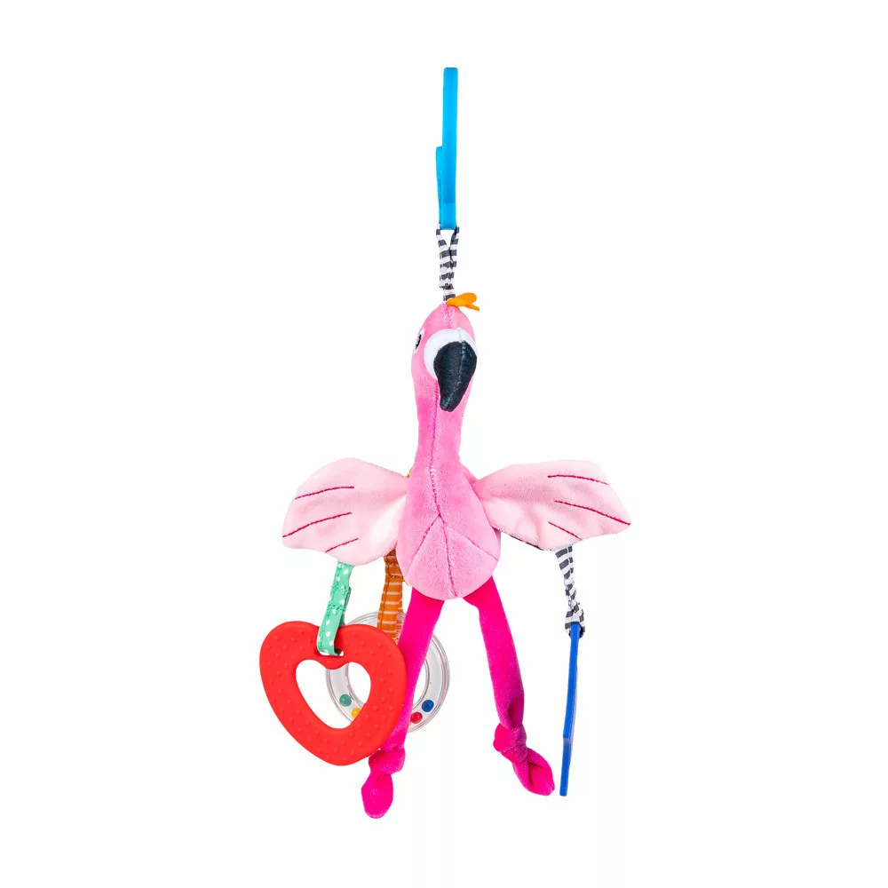 Egy színes flamingó felvidítja a babát és szórakozást nyújt neki. A madár szárnyait további játékok díszítik két színes és puha rágóka formájában. A játékhoz tartozik egy csilingelő gyűrű is, amely színes golyókkal van tele. A flamingó különböző textúrájú anyagokból készült, amelyek serkentik a kisgyermek tapintásérzékét, és arra ösztönzik, hogy érzékszervi úton fedezze fel a világot. A praktikus medál lehetővé teszi, hogy a játékot könnyen bárhová rögzíthesd. A termék újszülött kortól használható!