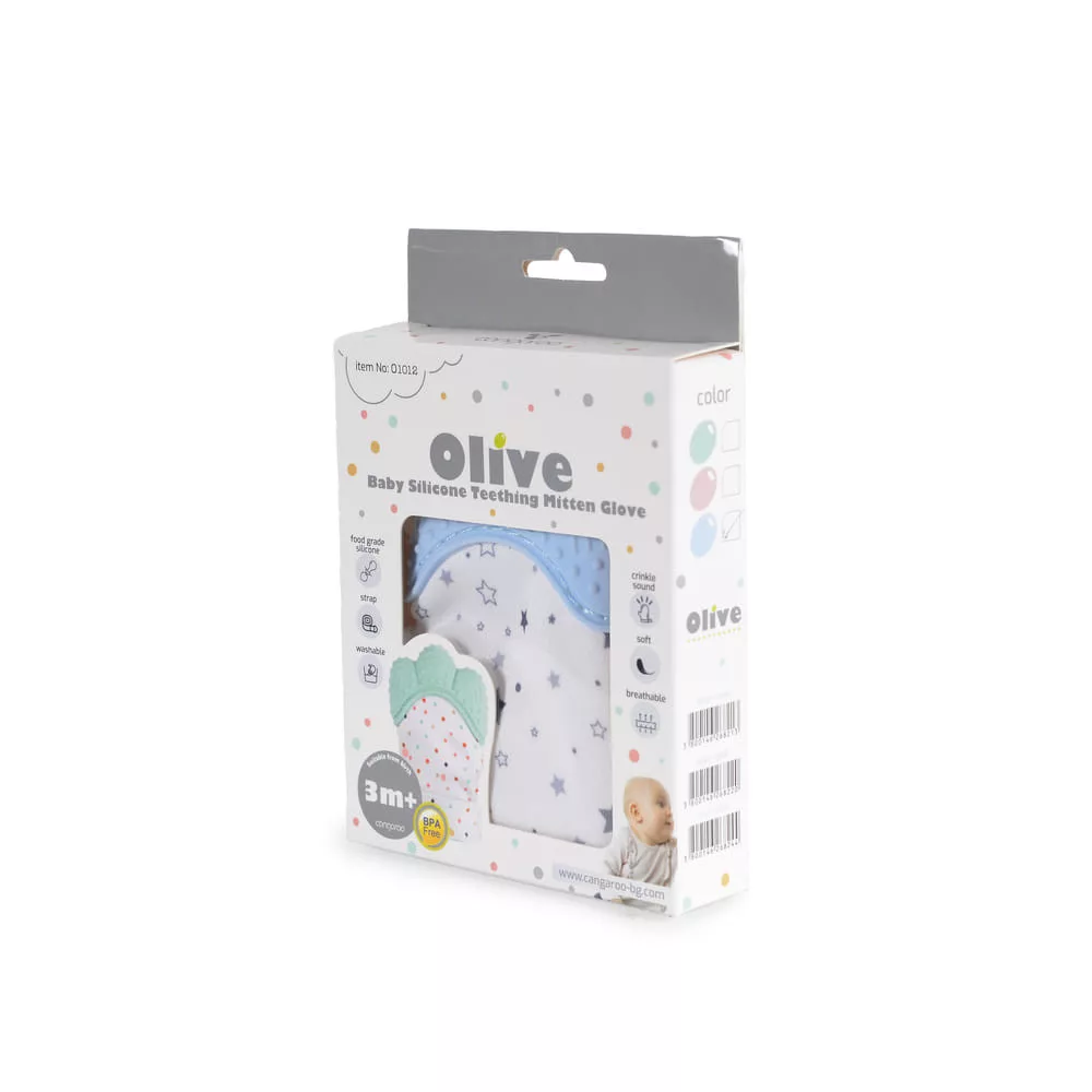 Az OLIVE Szilikon rágóka fogzáshoz kék nevű termék egy rendkívül praktikus kiegészítő minden kisbaba számára, aki éppen a fogzási fázison megy keresztül. A CANGAROO Olive termékcsalád része, amely gyönyörű kék színben pompázik - ezáltal a kicsik szeme számára is vonzóvá válik. A rágóka ujjra húzható, mint egy kesztyű, így a baba könnyedén megtarthatja azt és nyugodtan rágcsálhatja a fogai növekedését segítő szilikon felületét. A termék különösen higiénikus, mivel könnyen tisztítható. A rágóka segítségével a babák képesek lesznek enyhíteni a fogzással járó kellemetlen érzéseket, miközben játékosan is eltölthetik az időt.