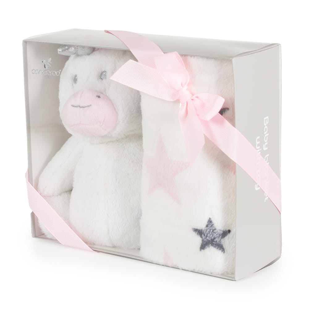 Ez a baba takaró egy különleges darab, amely nem csak melegen tartja a kicsit, de egyben egy szórakoztató játék is, mivel egy plüss unikornis van hozzá csatolva. Egy 90x75 cm méretű, puha, polár anyagból készült takaróról van szó, amely a legjobb választás a kuckózásra vagy ajándékozásra. Az unikornisos és csillag mintás design pedig minden kislány álma. Nem csak hasznos, de nagyon cuki is, tökéletes választás bármilyen alkalomra.