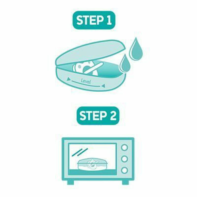 A sterilizáló tok lehetővé teszi a cumi fertőtlenítését a mikrohullámú sütőben mindössze 3 perc alatt, így 2 egyszerű lépésben eltávolítja a kórokozók 99,9%-át:
