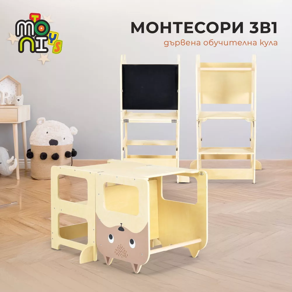 A Moni Toys torony egy multifunkcionális bútordarab, amely három fő funkciót egyesít, amelyek célja a gyermekek fejlődése és biztonsága a mindennapi életben. A gyermekek könnyű hozzáférését segíti a konyhapultokhoz, mosogatókhoz és étkezőasztalokhoz.