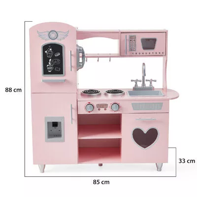 Nagy realisztikus rózsaszín konyha. Hűtőszekrény adagolóval; Mikrohullámú sütő; Tűzhely; Mosogató csapteleppel; Nyitható szekrények; Rajztábla. Márkanév: Moni Toys Méret: 85x33x88 сm Csomagolási méret: 85x15.5x38.5 cm Súly kg: 14,7 Életkor: 3 éves kortól