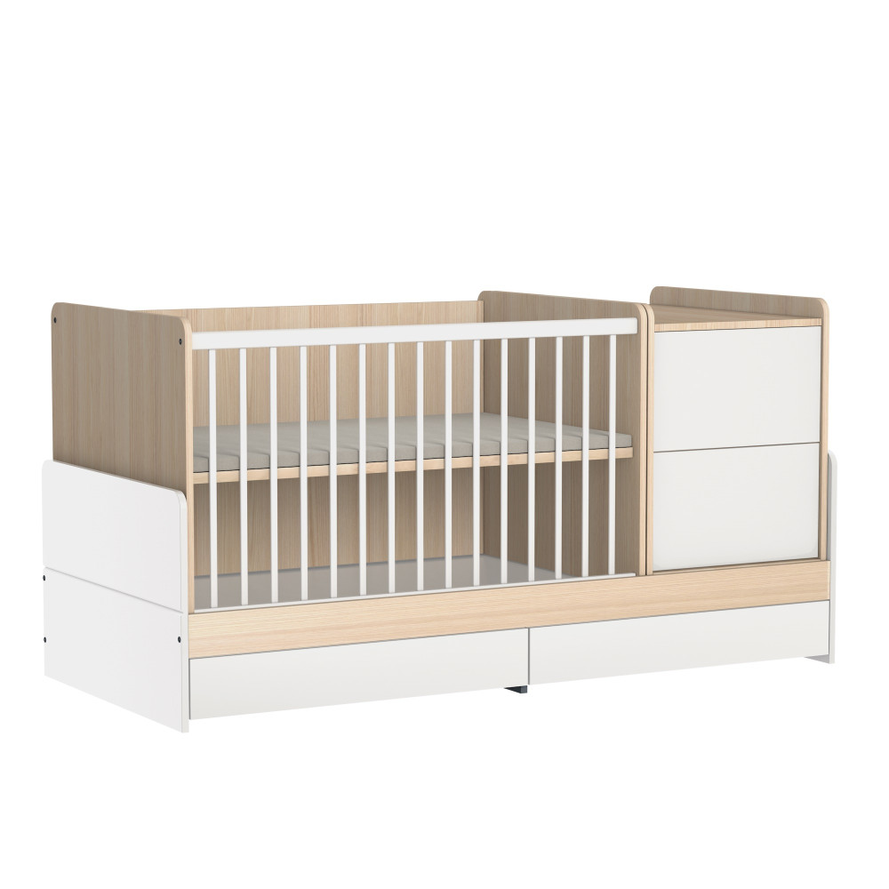 A legsokoldalúbb gyermekágyunk. Amellett, hogy a kezdeti időszakban babaágy és pelenkázó komód egyben, később még ifjúsági ággyá, valamint íróasztallá is alakítható.