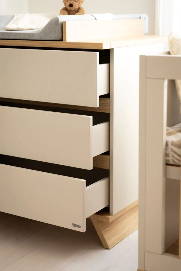 Magassága, a fiókok száma és terhelhetősége mind-mind az első időszak fontos társává teszi. A komódhoz alaptartozékként párosul a pelenkázó toldalék, mely az első 1 évben elengedhetetlen a kisbabád ápolásához. Ennek későbbi levételével továbbra is kiváló pakolófelülettel rendelkezik és otthonod sílusos darabja tud maradni.
