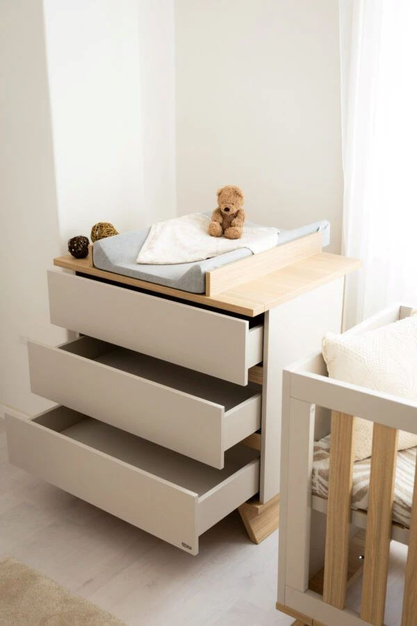 A babaszoba elengedhetetlen bútoreleme a komód és a hozzá tartozó pelenkázó toldalék. Úgy lett kialakítva, hogy viszonylag kis helyen is elférjen, mégis a lehető legnagyobb segítséget nyújtsa az újdonsült szülőknek.
