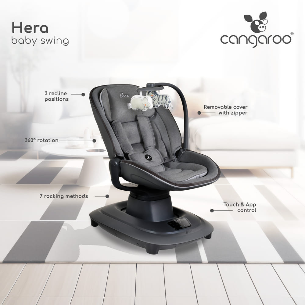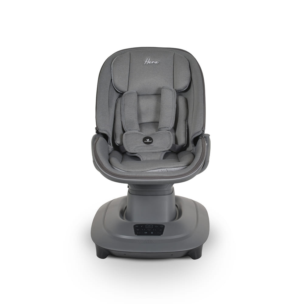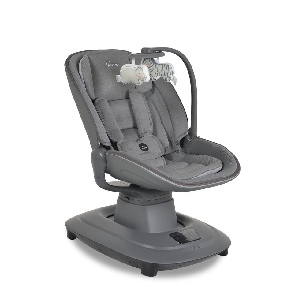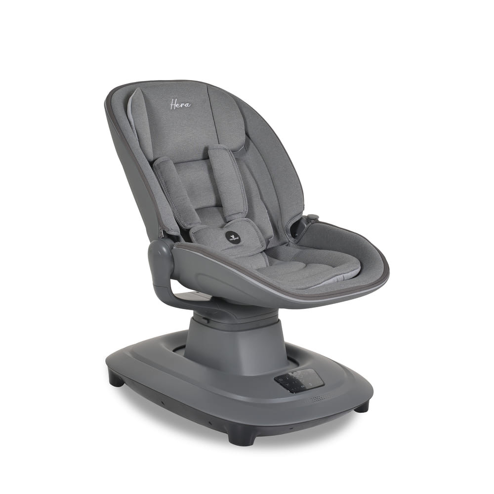 A Hera baba hintaló ötvözi az intelligens funkcionalitást a kényelemmel és a biztonsággal, így ideális választás a modern gyermekgondozáshoz. Érintőképernyős vezérlőpanellel, alkalmazás-összeköttetéssel és hét hintamozgással rendelkezik – öt hullám mód, három függőleges és három vízszintes. A hintához tartozik egy 360 fokban forgatható ülés, három dönthető pozíció és négyféle időzítő. A 12 beépített dallammal és hangerő-szabályzóval, szúnyoghálóval és két plüss játékkal ellátott, levehető játékruddal a Hera nyugodt és szórakoztató környezetet biztosít a babáknak. Az 5 pontos biztonsági öv vállpárnákkal, levehető cipzáras kárpitozással, extra párnával fejtámasszal és a mellékelt adapterrel kényelmet és biztonságot garantál a mindennapi használat során.