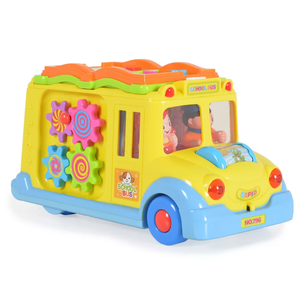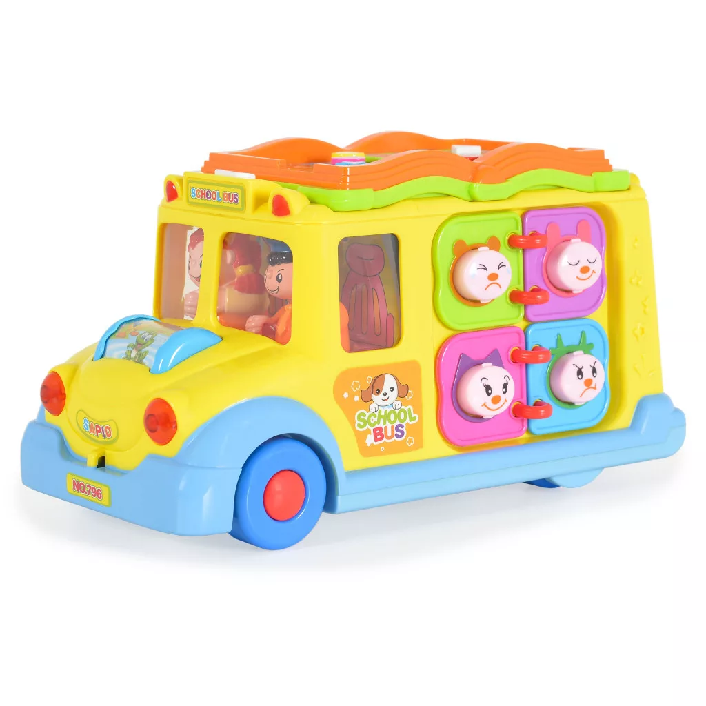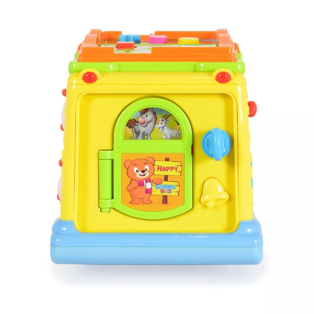 A busz szép kidolgozása és gazdag színei vonzzák a gyerekek figyelmét. A játék minden bizonnyal még a legigényesebb gyermeket is lenyűgözi. A busz magától mozog, és irányt vált, ha akadályba ütközik. Menet közben a fényszórói villognak, a vezető és az utas pedig zenére táncolnak. Az elején egy állatos görgő található, amely guruláskor világít, különböző dallamokat játszik, és nevető baba hangjait adja ki. A busz tetején egy kis könyv található. A könyv minden oldalán különböző színű és formájú gombok találhatók. Megnyomva az állatok hangjait hallhatjuk. Miután elfordítjuk a kulcsot, egy vicces hangot hallunk, az ajtó kinyílik, és mindig egy másik jelenetet mutat.
