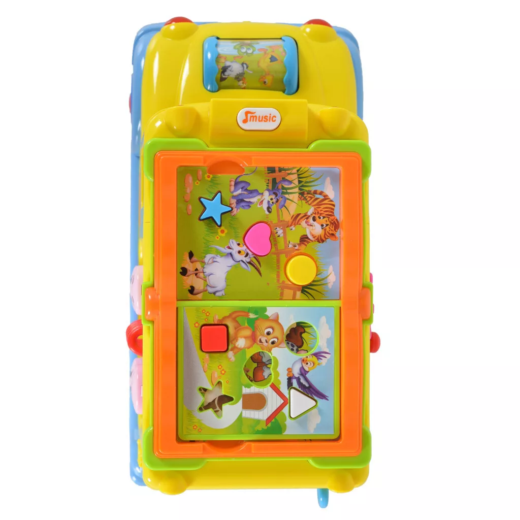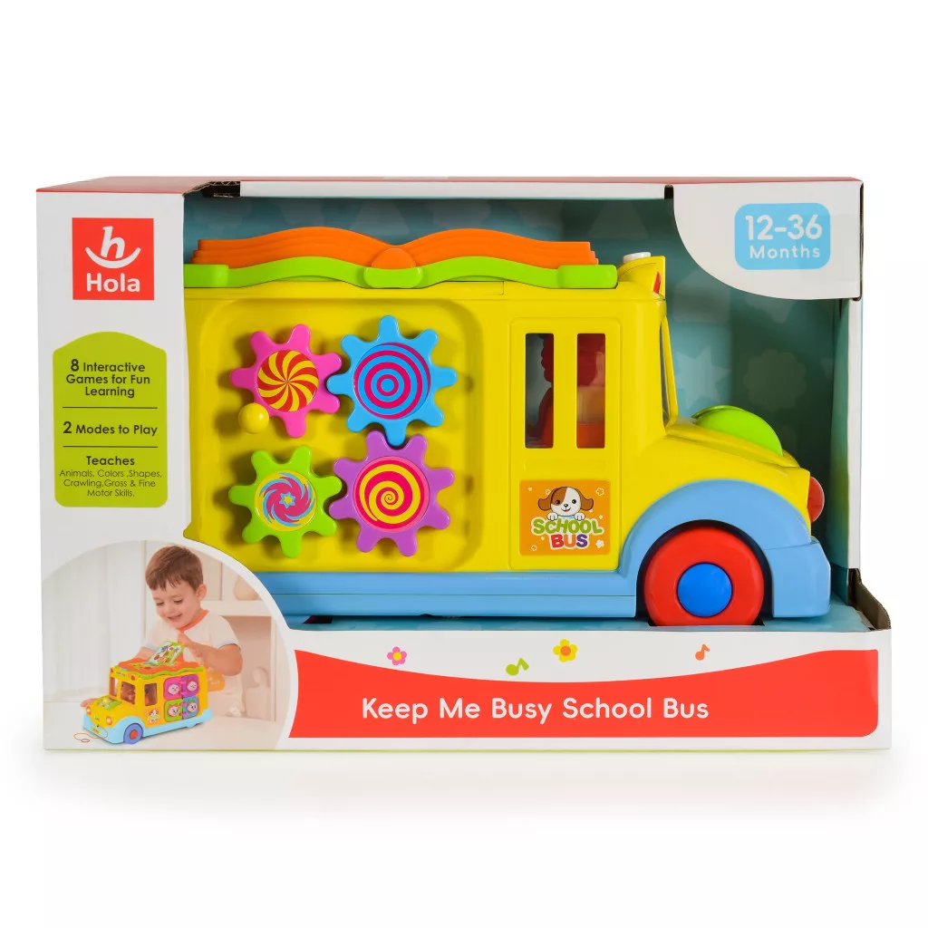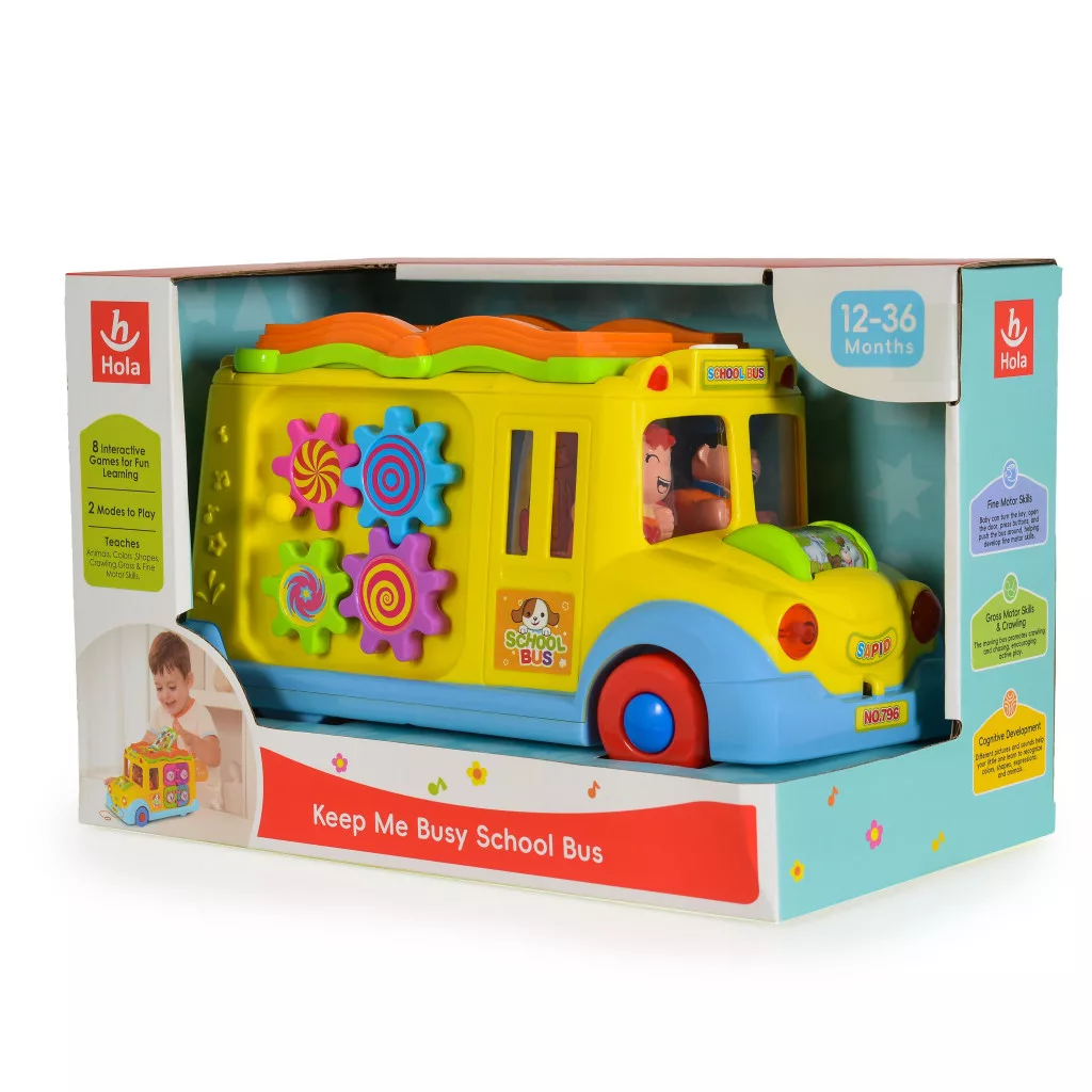A busz szép kidolgozása és gazdag színei vonzzák a gyerekek figyelmét. A játék minden bizonnyal még a legigényesebb gyermeket is lenyűgözi. A busz magától mozog, és irányt vált, ha akadályba ütközik. Menet közben a fényszórói villognak, a vezető és az utas pedig zenére táncolnak. Az elején egy állatos görgő található, amely guruláskor világít, különböző dallamokat játszik, és nevető baba hangjait adja ki. A busz tetején egy kis könyv található. A könyv minden oldalán különböző színű és formájú gombok találhatók. Megnyomva az állatok hangjait hallhatjuk. Miután elfordítjuk a kulcsot, egy vicces hangot hallunk, az ajtó kinyílik, és mindig egy másik jelenetet mutat.