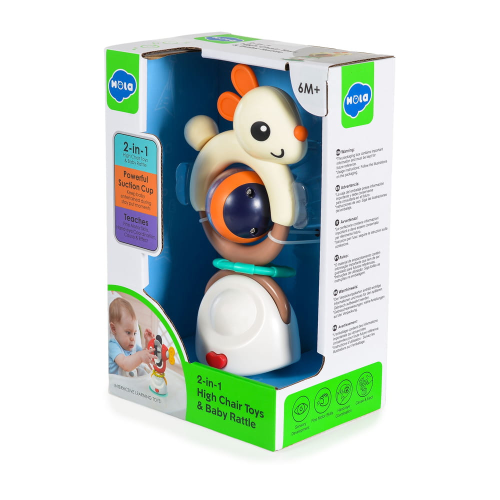 2 az 1-ben Etetőszékhez rögzíthető játék és csörgő rágóka. Etetőszékre rögzíthető igy segit lekötni a gyerek figyelmét az etetés idejére. Erős tapadókorongos rögzítési mód. Fejlesztik a színek és a formák a szem-kéz koordinációt.