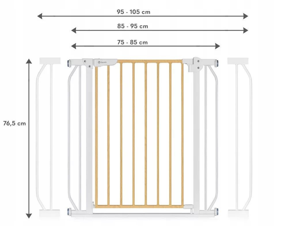 Széles , 75 és 85 cm közötti tartomány megfelel a legtöbb standard ajtókeretnek. A 2 db toldó lehetővé teszi a korlát 105 cm-ig történő meghosszabbítását. További meghosszabbítás hozzáadása után a kapu a lépcsők védelmére is használható.