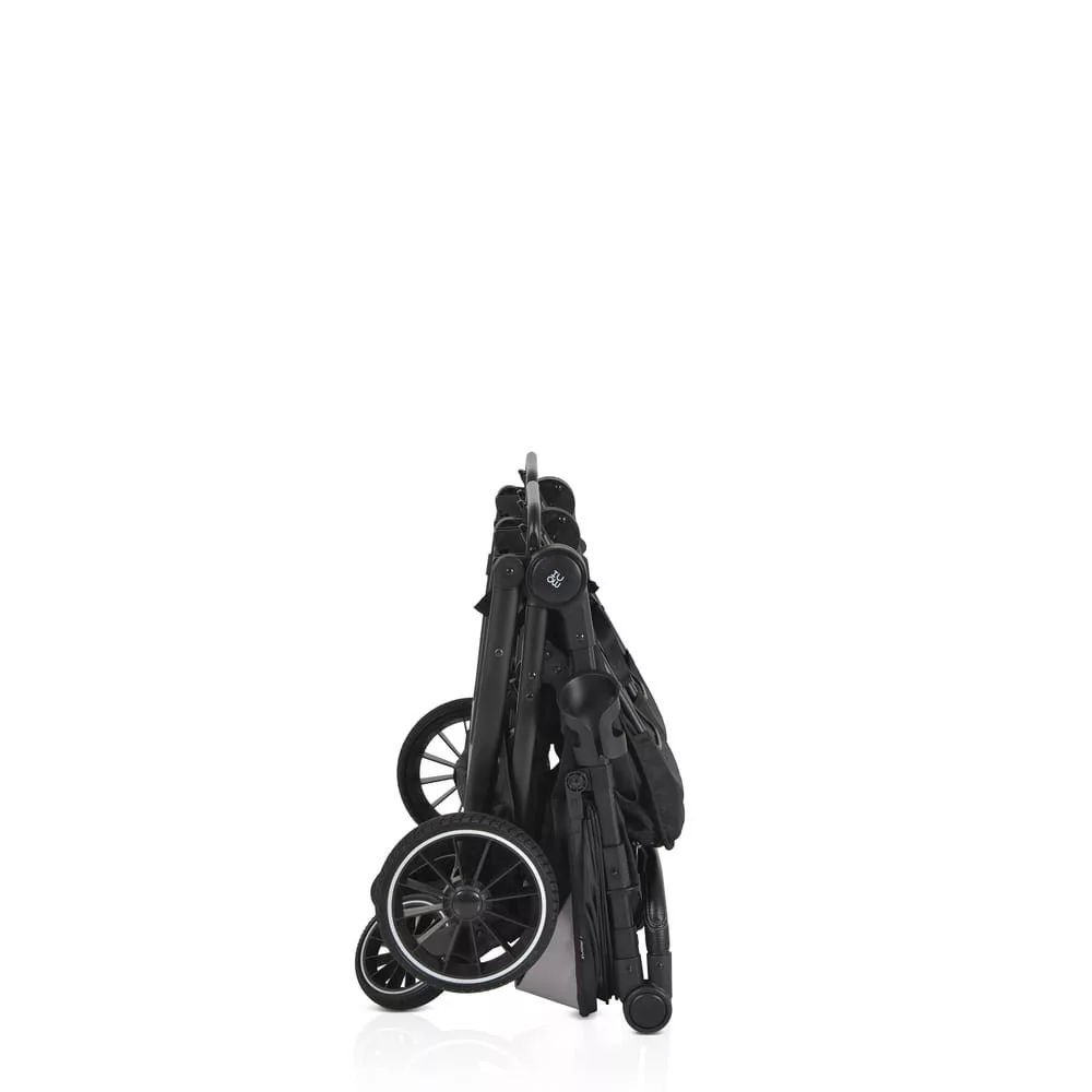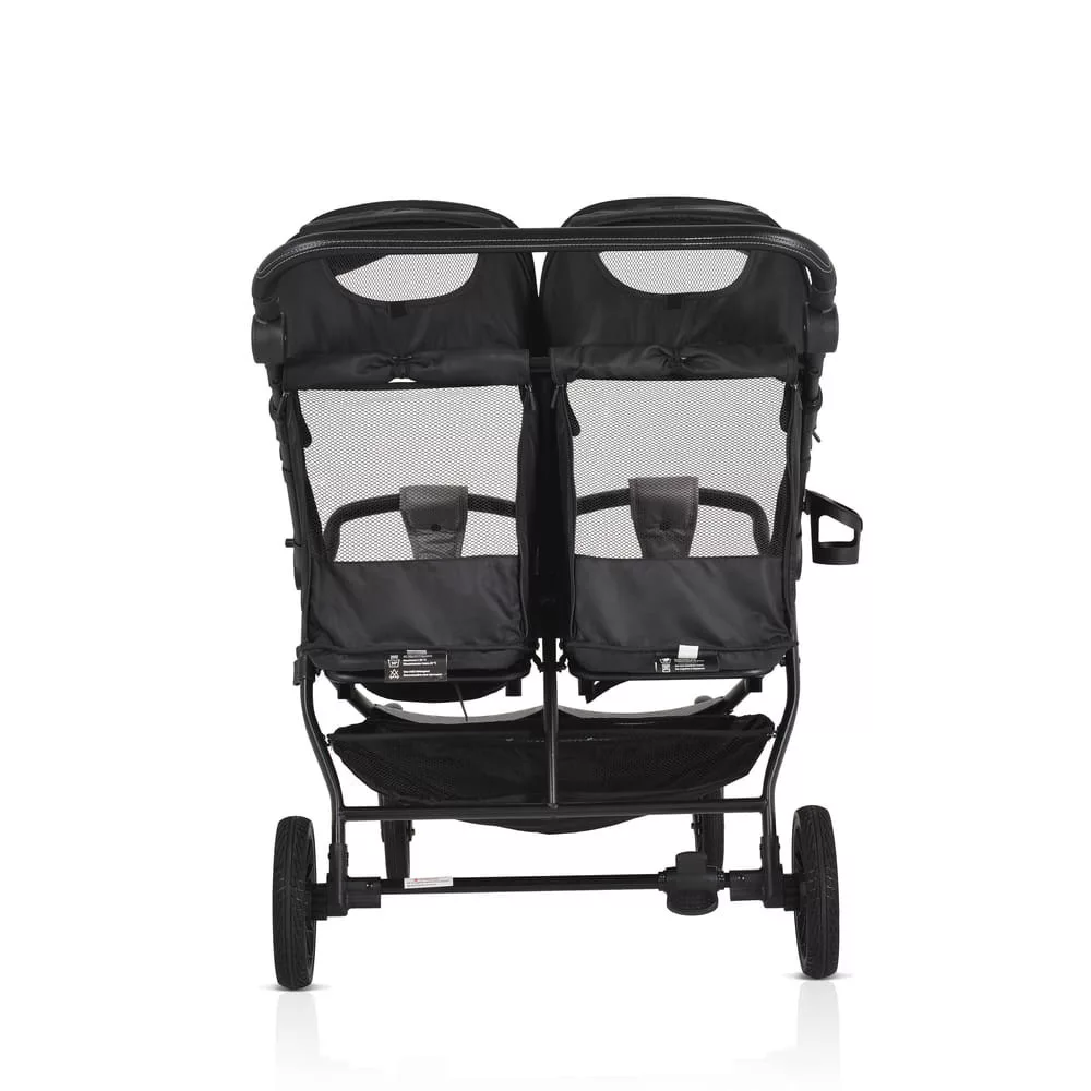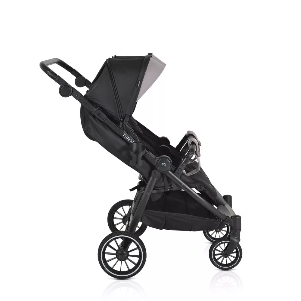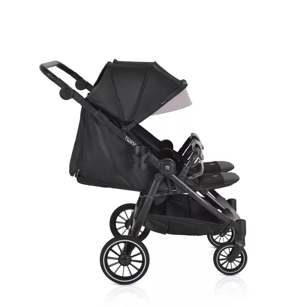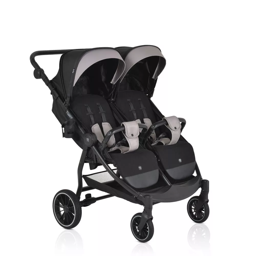 Az iker babakocsi születéstől körülbelül 36 hónapos korig alkalmas, legfeljebb 15 kg súlyú gyermekek számára. Három pozícióban dönthető háttámlával rendelkezik, beleértve a teljesen sík helyzetet, és egy hálós részt a jobb szellőzés érdekében. A kupola állítható, napellenzővel és hálós ablakkal a megfigyeléshez. A fogantyú állítható, öt pozícióban, varrott PU bőrből készült. Az 5 pontos biztonsági öv puha párnázással gondoskodik a biztonságról. A babakocsi első PU kerekekkel van felszerelve, amelyek 360 fokban forognak, reteszelő mechanizmussal és lengéscsillapítókkal minden keréken. A kerekek egy gombnyomással egyszerűen eltávolíthatók. Kompakt és könnyen összecsukható. Levehető PU bőr lökhárító rúd és három pozícióban állítható lábtámasz. A háttámlán tárolózseb áll rendelkezésre a tartozékok számára. A készlet praktikus cipzáras lábvédőt és pohártartót tartalmaz.