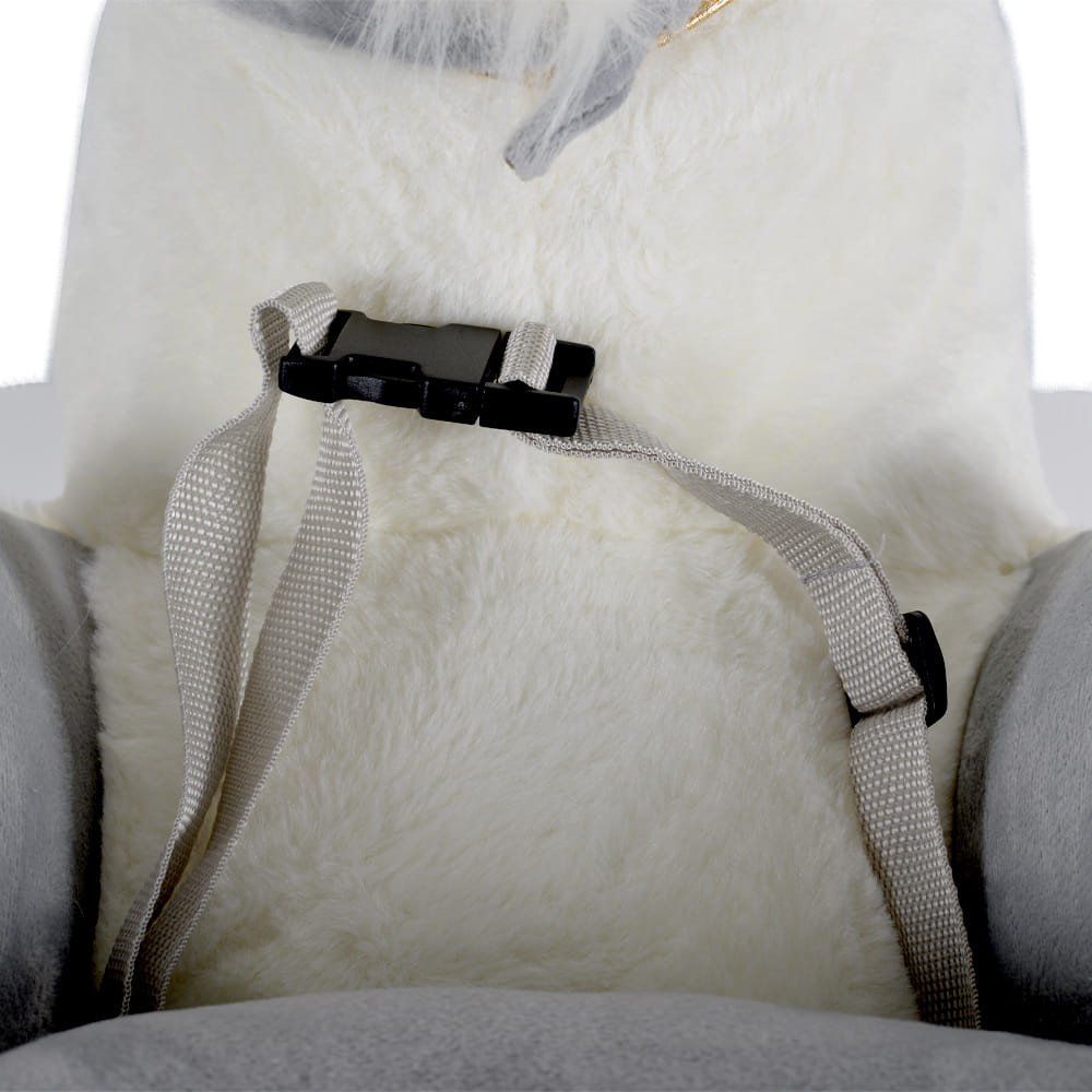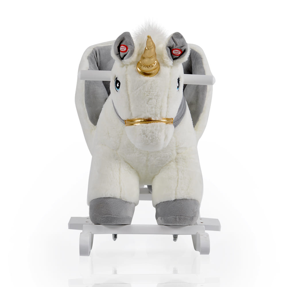 A MOON hintázó unikornis egy puha játék, mely 20 kg-ig terhelhető, így 12 hónapos kortól ajánljuk. A hintázás mellett zenél is, hogy még izgalmasabb legyen a játékidő. A működéshez 3 db LR44 típusú elem szükséges. Ez a szürke, unikornis mintás hintaló garantáltan feldobja a gyermekszoba hangulatát, és a gyerekek imádni fogják hosszú órákon keresztül hintázni vele.