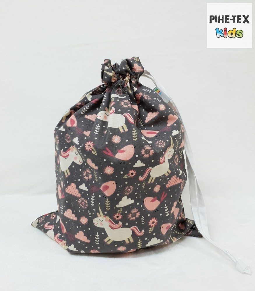 A tornazsák a tetejére varrt zsinórral záródik, így gyermeked könnyedén be-, kipakolhatja belőle a tornafelszerelését.