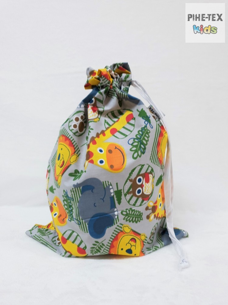 A tornazsák a tetejére varrt zsinórral záródik, így gyermeked könnyedén be-, kipakolhatja belőle a tornafelszerelését.