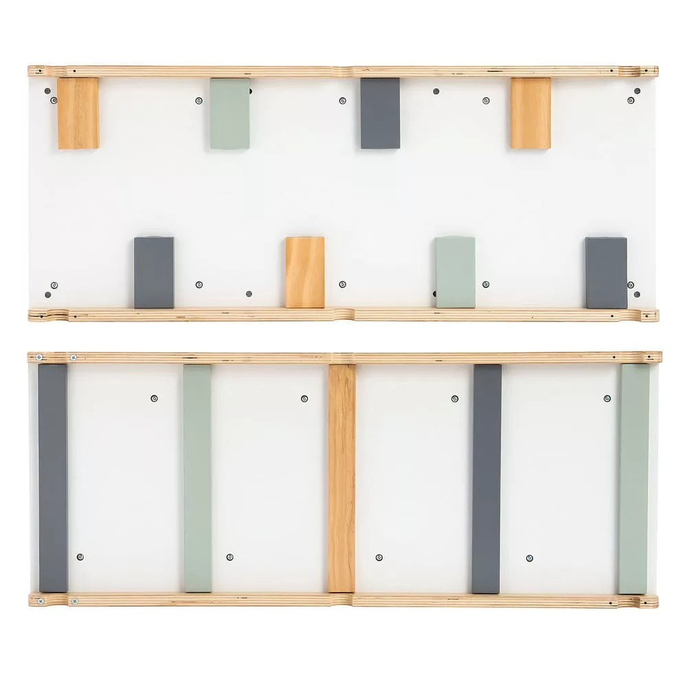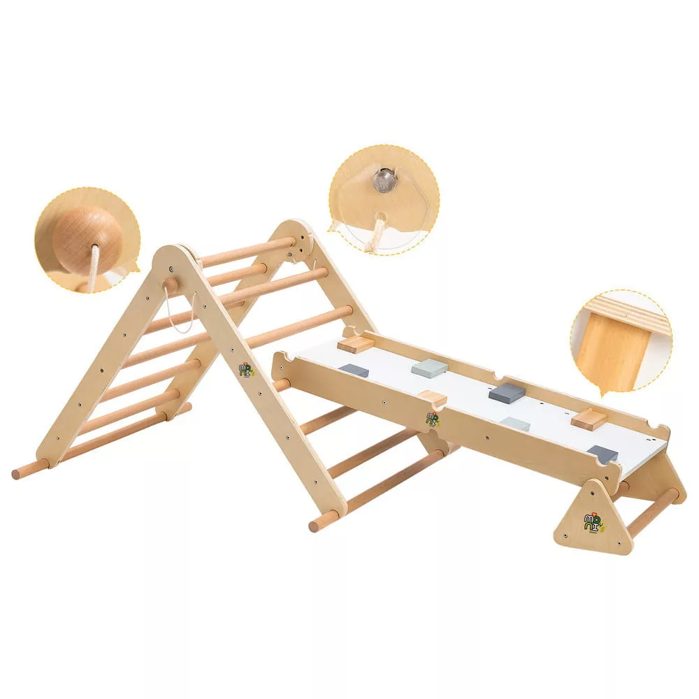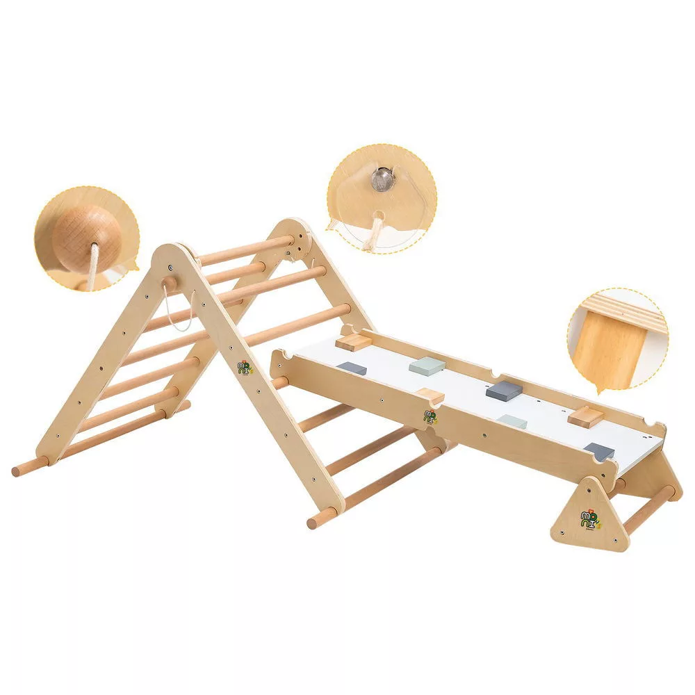 Többfunkciós fa mászóka. Pikler-háromszög, mászó rámpa, egyensúlyozó deszka. Különböző állítási pozíciók, összecsukható a kompakt tároláshoz. Kétoldalas rámpa. A megengedett maximális súly legfeljebb 50 kg. Tömör fából készült. Biztonságos és lekerekített sarkok. Egyszerű összeszerelés.