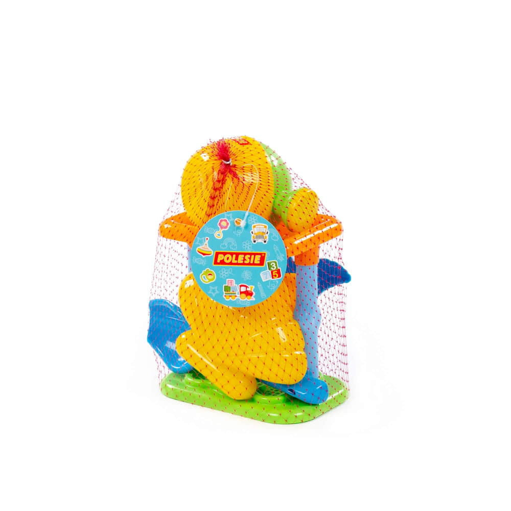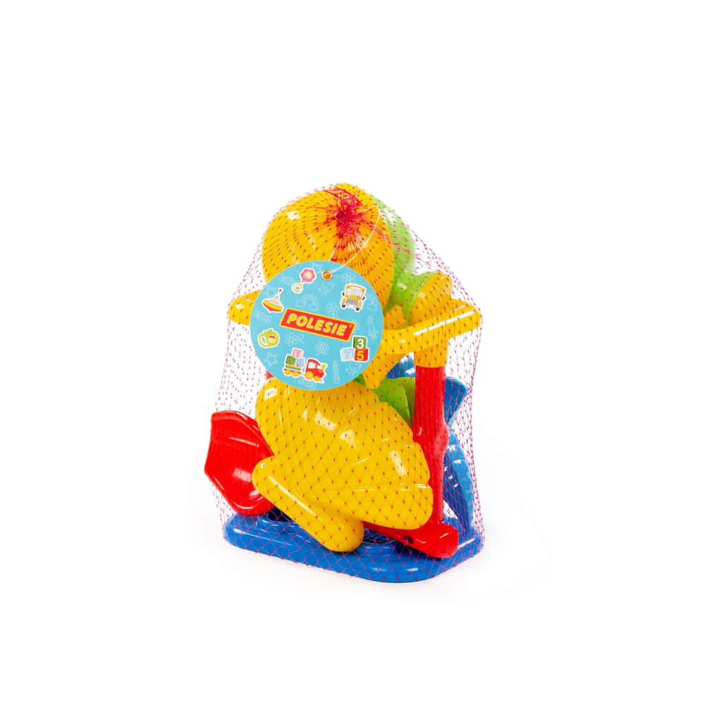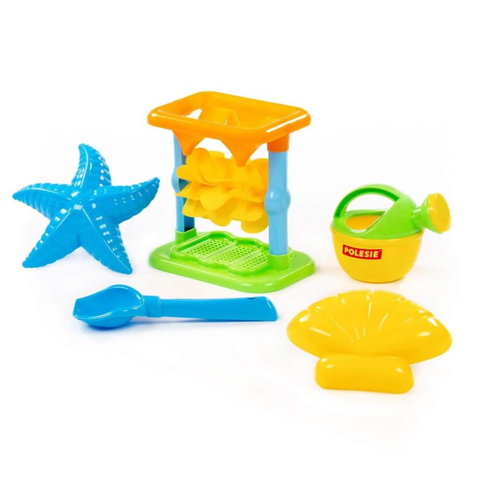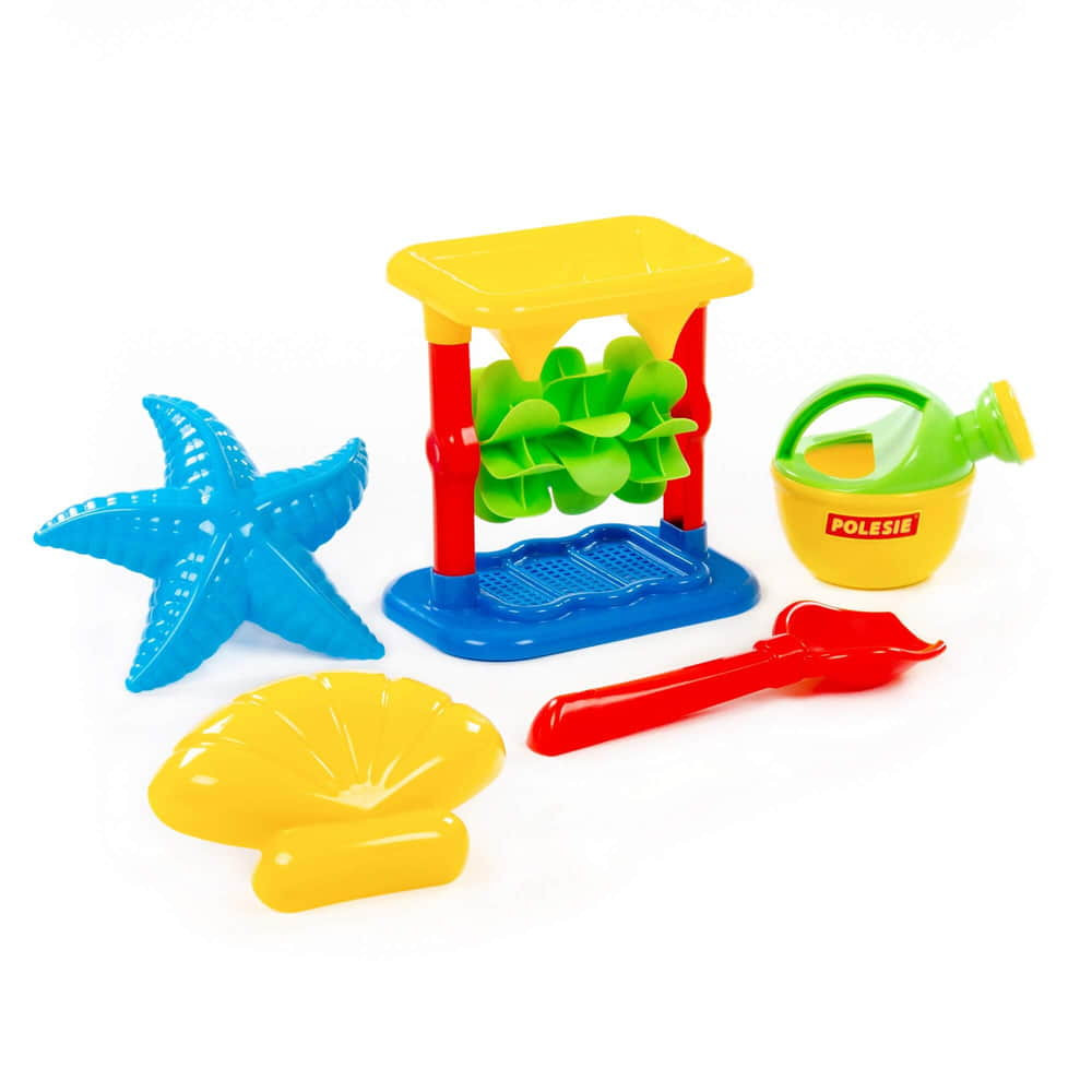 Strandkészlet malommal. A készlet a következőket tartalmazza: egy kismalom, egy lapát, egy locsolókanna és 2 homokformát: kagyló és tengeri csillag