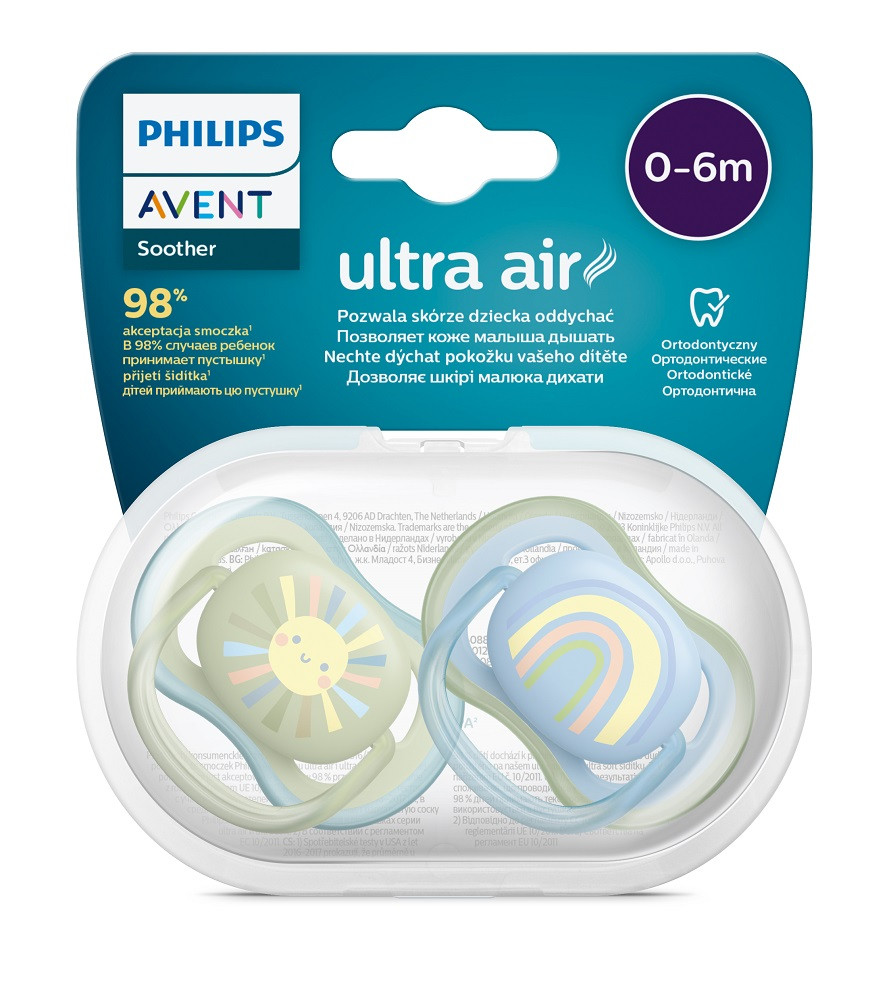 Hagyja a baba bőrét lélegezni. Extra nagy levegőnyílások a kényelmesebb megnyugtatás érdekében.A levegő kellemességével biztosít megnyugvást. A Philips Avent ultra air cumi extra nagy levegőnyílásokkal rendelkezik, így a baba bőre száraz marad. Különféle színekben és kivitelekben kapható.Tulajdonságok:- Sterilizálás és tárolás egyetlen praktikus tokban- Kényelmes sterilizálás 3 perc alatt- Szellőzés és megnyugvás- Biztosítja a baba bőrének légzését- Kényelmesen puha, bársonyos cumi- Extra erős cumifej- A játszócumi 100% szilikonból készült- A szájüreg természetes fejlődése- Garantált minőség- Hollandiában tervezték és gyártottákBiztosítja a baba bőrének légzésétAz extra nagy levegőnyílások szellőztetik a baba bőrét, így az szárazabb marad cumizás közben.Extra erős cumifejAz extra erős cumifej illeszkedik a szájpadlás, a fogak és az íny természetes alakjáhozA játszócumi 100% szilikonból készültSzándékosan választottuk a szilikon anyagot az Ultrasoft és Ultra air játszócumikhoz, mert ez egy biztonságos és inert anyag, amelyet gyakran használnak az orvosi gyakorlatban, és amely mentes a veszélyes vegyi anyagoktól, endokrin aktív összetevőktől (pl. BPA) és allergénektől.Fogszabályozós játszócumiOrtodontikus, szimmetrikus és puha szilikon cumijainkat úgy terveztük, hogy biztosítsák a szájpadlás természetes fejlődését.Természetes a baba számáraTexturált szilikon cuminkat úgy terveztük, hogy hasonlítson az anya mellére.3 perc alatt sterilizálhatóAz Ultrasoft és Ultra air cumijainkhoz mellékelt utazótok egyben sterilizálóként is szolgál. Csak öntsön bele vizet, és tegye be a mikrohullámú sütőbe Nyugodt lehet afelől, hogy tiszta és használatra kész lesz a következő alkalomra.Hollandiában készültUltrasoft és Ultra air játszócumijainkat Hollandiában tervezték és gyártják.- Fontos! A termék egészségvédelmi és higiéniai terméknek minősül. Amennyiben a csomagolás felbontásra került, vagy a kipróbálás jelei látszódnak a terméken, úgy a 14 napos elállási jog érvényét veszíti a 45/2014. (II. 26.) korm. rendelet 29. § (1) bekezdése alapján.