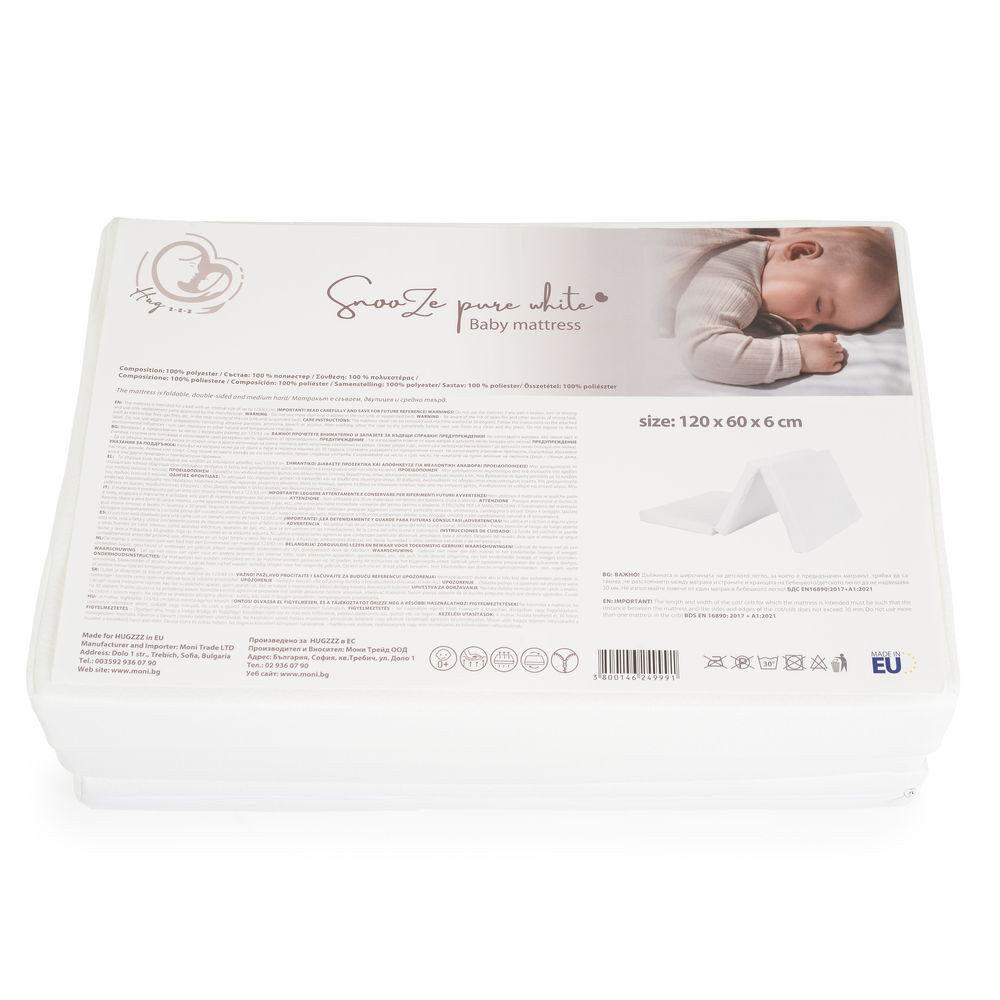 A SNOOZE összecsukható matrac a Hugzzz termékcsaládjának egyik tagja, 120 x 60 x 6 cm méretben tiszta FEHÉR színben. Az egészséges és nyugodt alvást elősegítő matrac természetes anyagokból készült, és olyan tulajdonságokkal rendelkezik, mint az anti-gyulladásos, gombaellenes, vírusellenes és természetes antibiotikus hatás. Nem csak a kényelmet szolgálja, hanem támogatja és megnyugtatja az immunrendszert is. Ez a matrac egy hosszú, nyugodt alvást biztosító megoldás, amit könnyedén összehajthatsz és magaddal vihetsz, ha útra kelsz. Kiváló választás bármelyik kiságyba, de akár a nagyihoz is magaddal viheted, hogy a bébi mindig a megszokott kényelemben alhasson.
