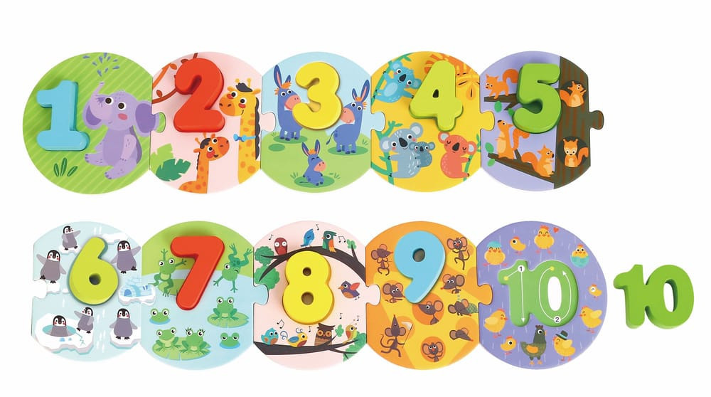 Tartalmaz 10 karton puzzle-darabot és fából készült számokat 1-től 10-ig.