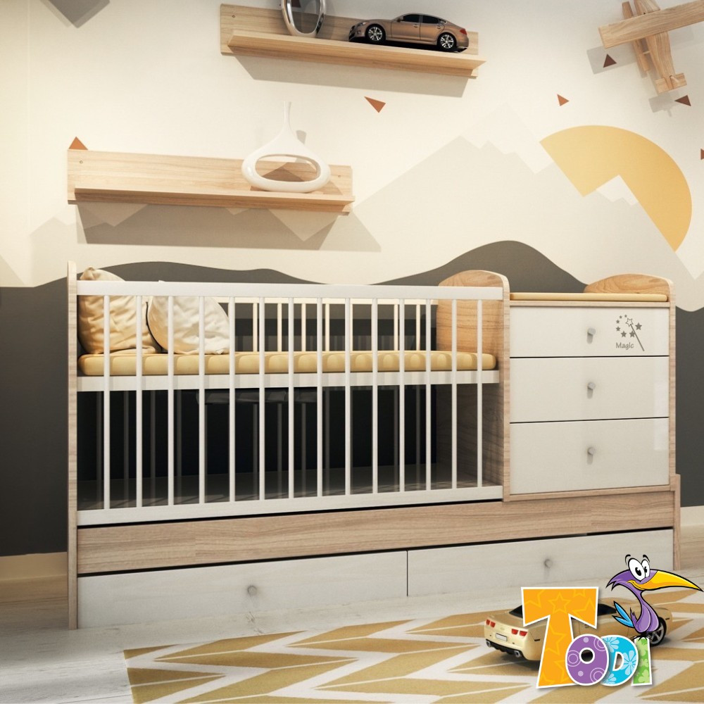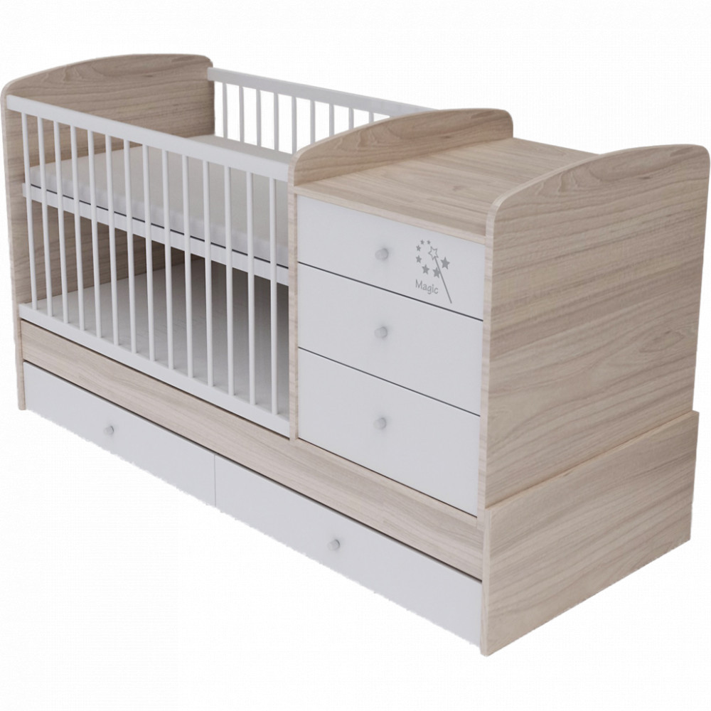 A Magic elegáns, klasszikus megjelenésű termékcsalád, amely szupermatt felületű, fahatású bútortesttel és magasfényű fehér fronttal rendelkezik. A maximális helykihasználást szem előtt tartva terveztük a Magic pelenkázóval kombinált gyerekágyunkat, mely 2 éves korig babaágyként, 2-8 éves kor között juniorágyként használható. A fekvőrács három magasságban állítható. A gyerekágy a rácsok és a komód rész eltávolítása után ifjúsági heverővé alakítható, a komód pedig éjjeli szekrénnyé válhat. A gyerekágy átalakításához nincs szükség pótalkatrészek megvásárlására. A gyerekágy alatt található két részes gurulós ágyneműtartó is segíti a kényelmes tárolást. Az oldalrácsai bükkfából készülnek, 2 kivehető pálcával rendelkeznek, és egészségre ártalmatlan vizes bázisú lakkal vannak felületkezelve. Oldalrácsai lapospálcás kivitelűek. A bútortestek és frontok élei 2 mm vastag Pvc-vel (un.:ABS) kerülnek élzárásra, melyek a hagyományos élfóliákhoz képest sokkal magasabb élettartamot biztosítanak. A gyerekágy lapra szerelve kerül becsomagolásra, az összeszerelési útmutatót mellékeljük, amivel könnyen összeszerelhetik bútorukat.