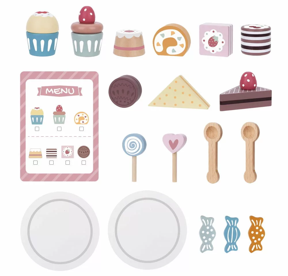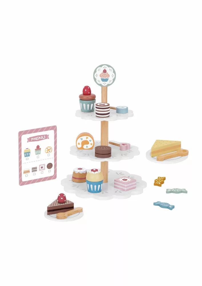 Gyönyörű fából készült készlet édességekkel. A készlet a következőket tartalmazza: állvány, étlap, édességek, tálalóeszközök. A készlet remek kiegészítője bármelyik gyerekszobának vagy gyerekkonyhának. A gyermek szórakozás közben tanulhat. A szerepjátékon keresztül a gyerekek fejlesztik szociális, motoros és kommunikációs készségeiket. Márka: Tooky Toy Méret: 22x22x31 сm Csomagolási méret: 22x22x6 cm Súly: 1.0kg Életkor: 3 éves kortól