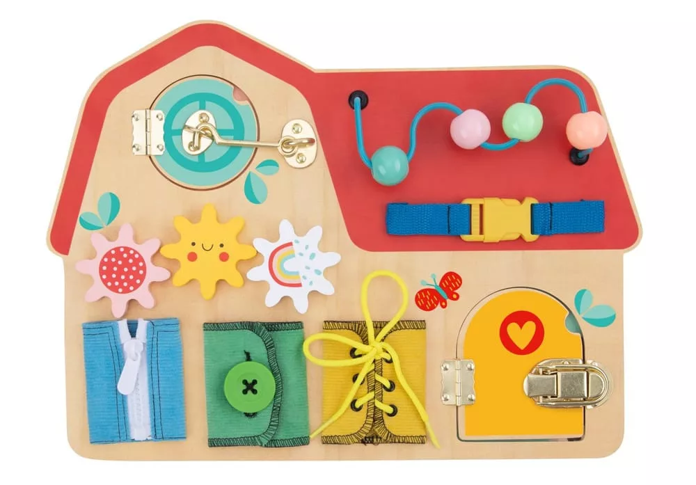 Tooky Toy Montessori fa tábla TH642 Ez a fából készült zsúfolt tábla egy alapvető készség tábla fényes szivárványszínű fadarabokkal. Tartalmaz cipzáros játékrészt, és egy cipőkötési oktatókészletet gyerekeknek, amely lehetővé teszi a gyermekek számára, hogy megtanuljanak cipőt kötni, és önálló öltözködési készségeket szerezzenek. 36 hónaposnál idősebb gyermekek számára alkalmas.