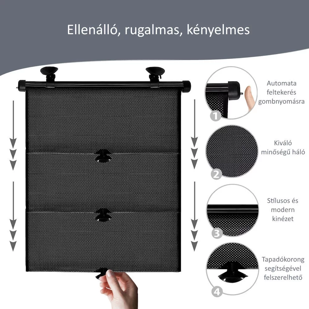 - Nemkívánatos napsugarakkal szembeni védelem- Praktikus tekercselés gombnyomásra- Tapadókorongok biztosítják, hogy a roló a helyén maradjon.