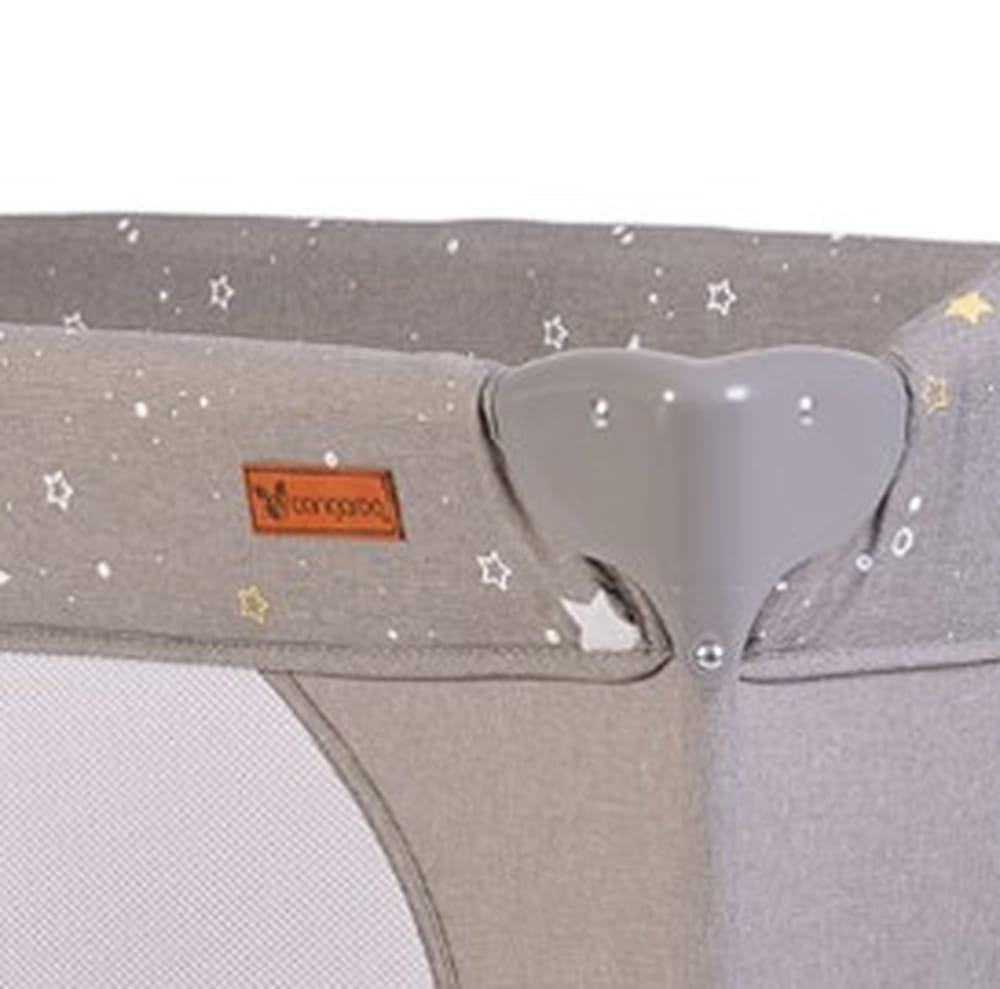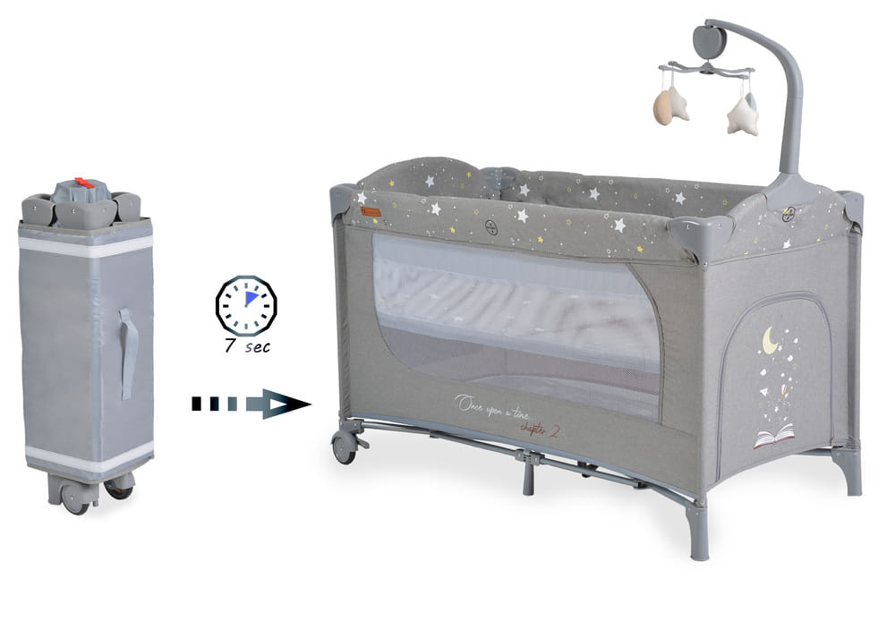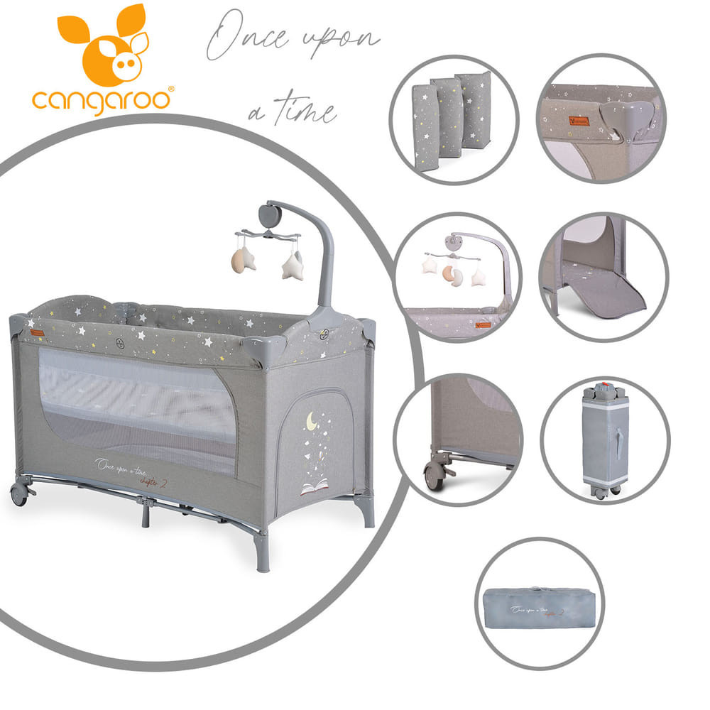 Ez a CANGAROO Once Upon a Time L2 összecsukható játszó- és bölcsőágy újszülötteknek és 14 kg-ig terjedő súlyú gyermekeknek lett tervezve. A szürke színű utazóágy két szinten használható, így a baba növekedésével állítható a magassága. A zenélő forgó játék, ami a csomag része, szórakoztatja a babát és segít elaludni. Könnyen összecsukható és szállítható, így ideális választás utazáshoz. Az ágy kialakítása biztonságos és kényelmes, hogy a baba jól érezze magát benne, míg te pihenhetsz vagy intézheted a dolgaidat. Az ágy anyaga könnyen tisztítható, így mindig tiszta és higiénikus környezetben tartózkodhat a kicsi.