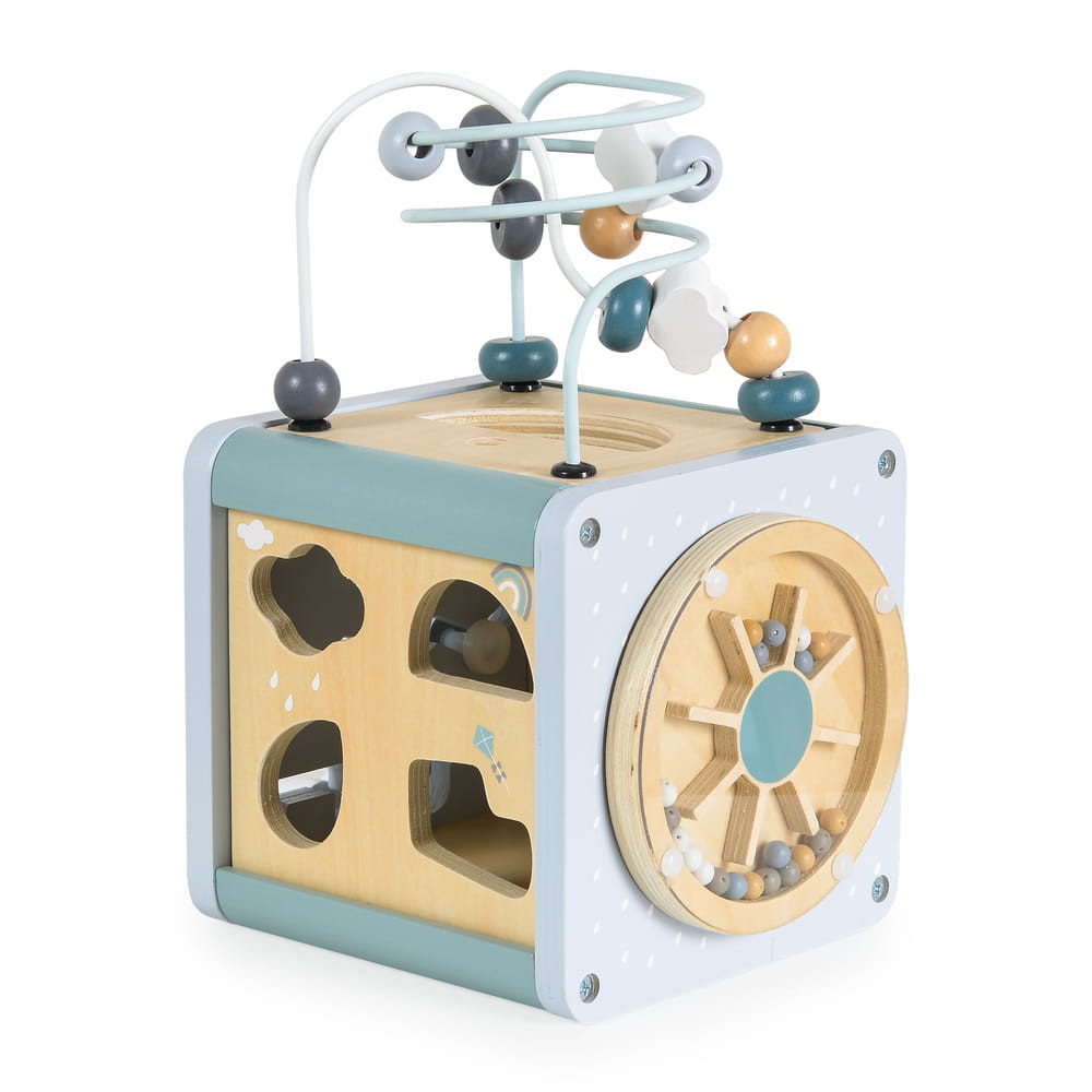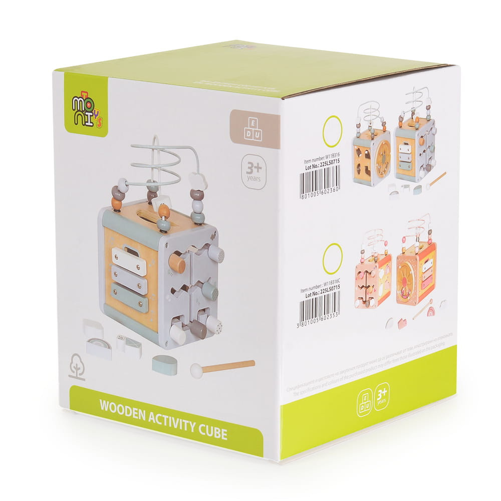 A Moni Toys többfunkciós, fából készült fejlesztő kockája szórakozást és játékon keresztüli tanulást kínál! Mindegyik oldalon más-más tevékenység található, amely serkenti a képzeletet és támogatja gyermeke fejlődését.